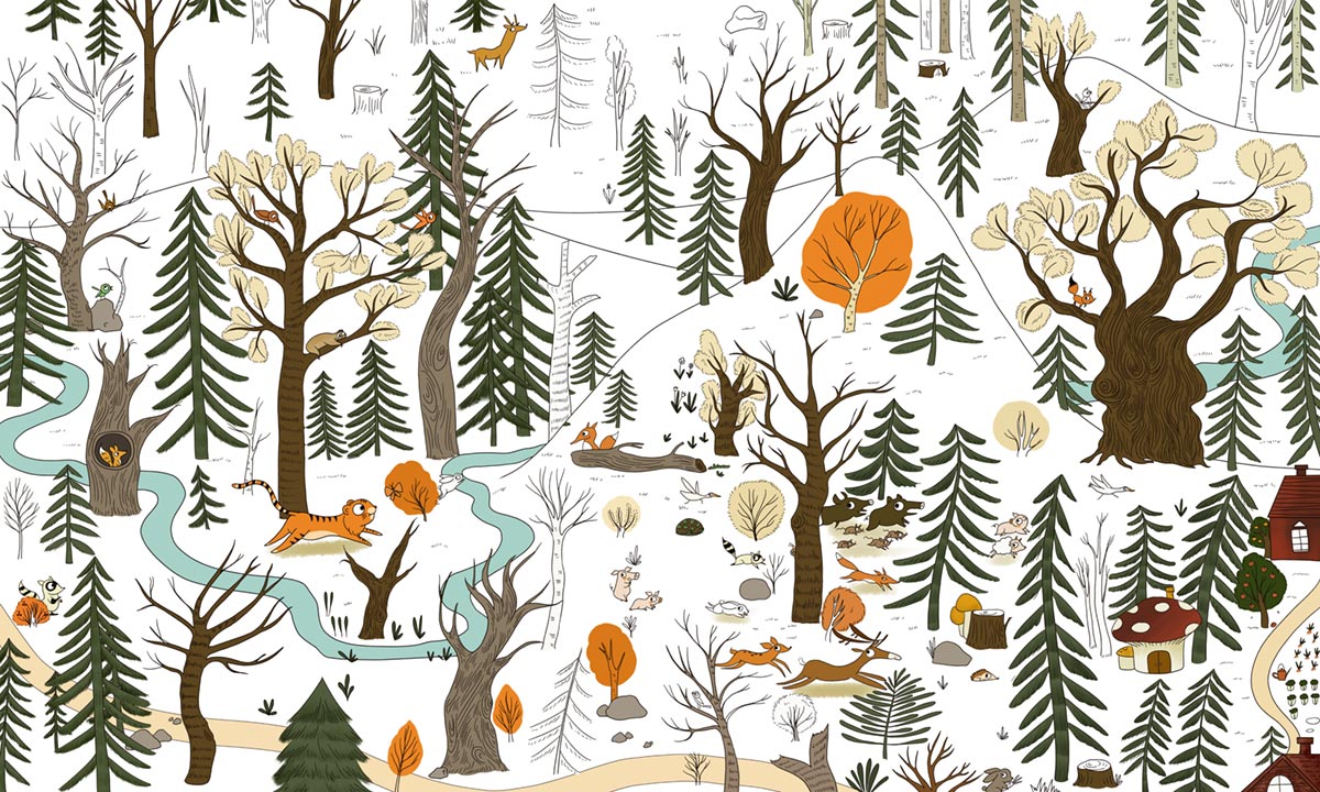 Bring nature indoors with this enchanting forest and animal-themed wallpaper, perfect for sparking imagination in any child's room. This beautiful design features playful woodland creatures amongst detailed trees, creating a peaceful and engaging backdrop.