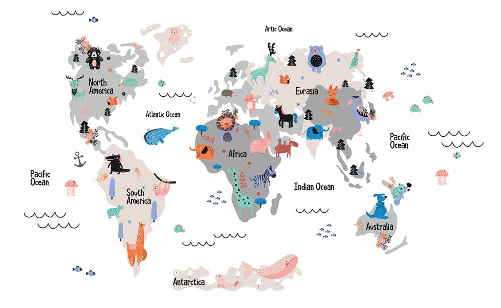 Explore a world of whimsy with this colorful world map wallpaper featuring a playful twist of animal illustrations. Perfect for sparking imagination and adventure in your child's bedroom or playroom, it's educational and stylish!