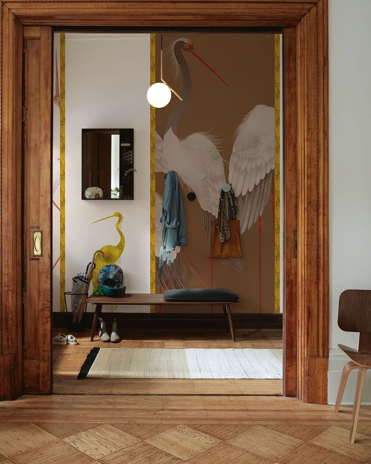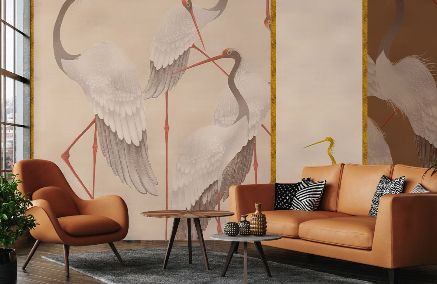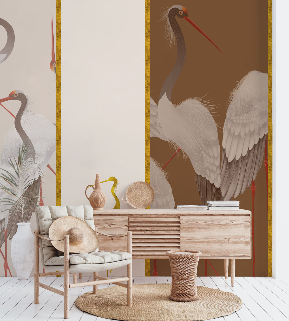 Adorn your walls with sophistication with our Elegant Gold Crane Bird Wallpaper. Embrace the timeless beauty of the graceful crane, accented by a luxurious gold backdrop, perfect for creating a serene and elegant atmosphere in any room.
