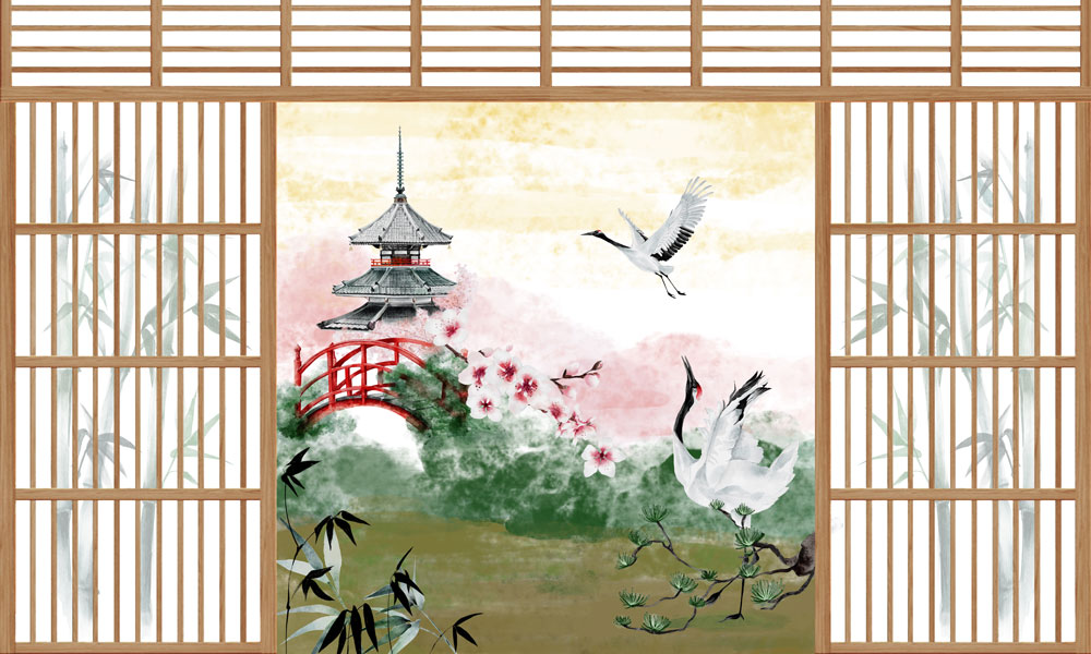 Cranes at Tranquil Pagoda Mural Wallpaper