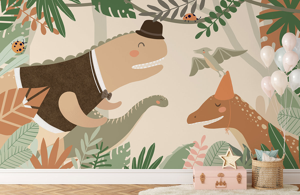 Transform your child's room into a prehistoric adventure with our Whimsical Dinosaur Jungle Kids Wallpaper. Featuring friendly dinosaurs in a lush, playful jungle, it brings a sense of fun and creativity to any space, perfect for sparking imaginations.