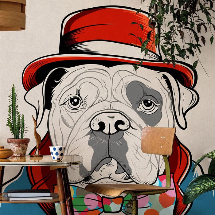 Infuse your space with personality using this vibrant Dapper Dog wall mural. Perfect for adding a whimsical and playful vibe to any room, this wallpaper features a stylishly attired dog in bold colors, making it a unique conversation starter.