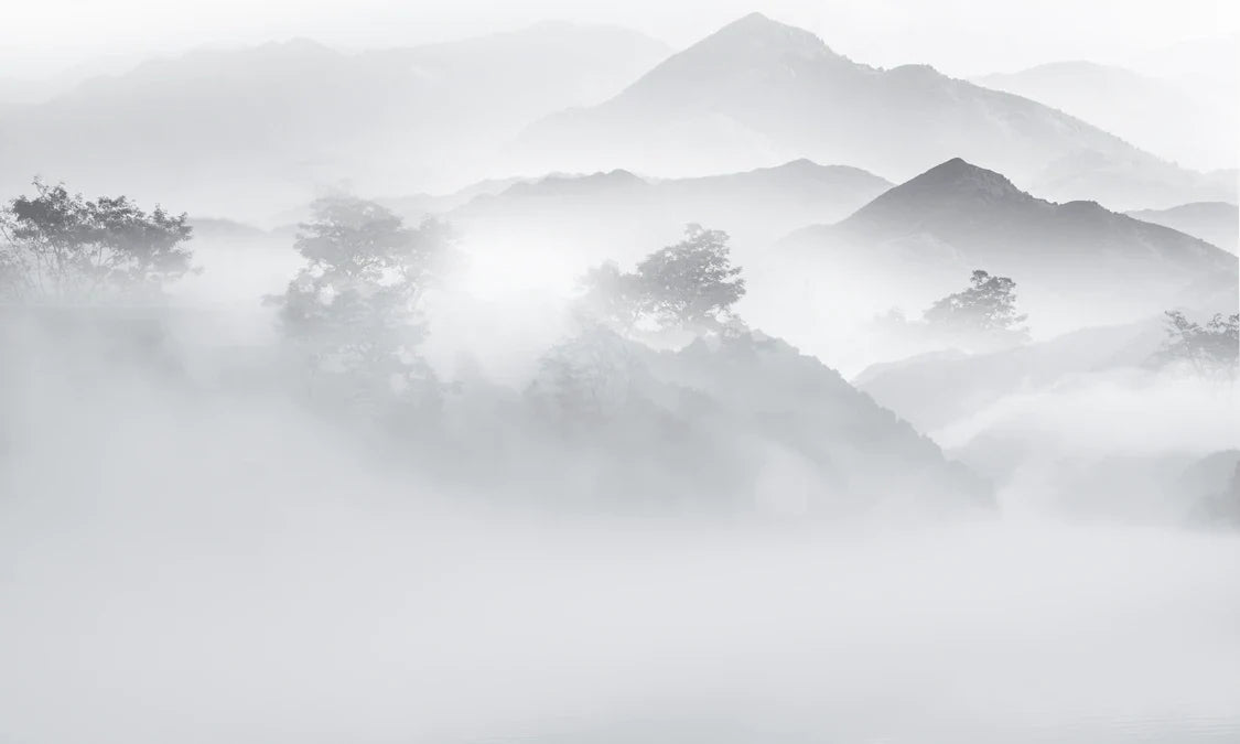 Evoke the serene beauty of misty mountains with this monochrome landscape wallpaper. Perfect for creating a tranquil, modern space, its elegant grey tones blend well with various interior styles, making it a versatile choice for any room.