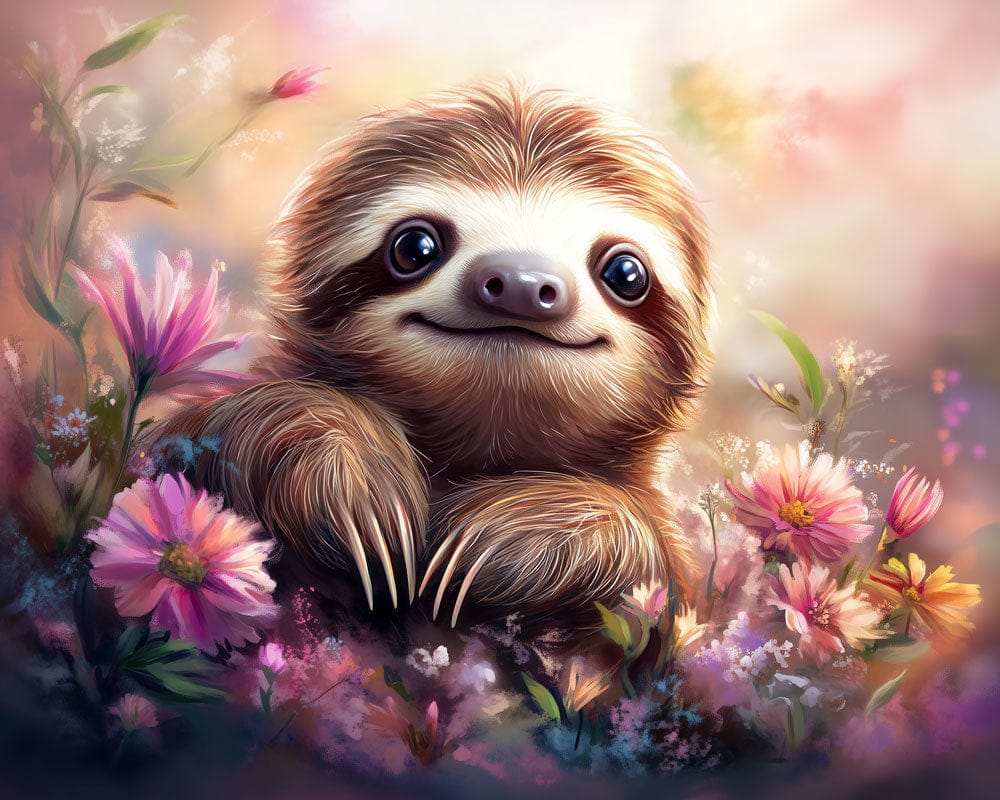 A charming sloth rests gently among soft blossoms, surrounded by warm light and pastel hues. Delicate brushwork and a dreamy glow create a calm, storybook atmosphere. This mural brings warmth, innocence, and a soothing sense of joy to any space.