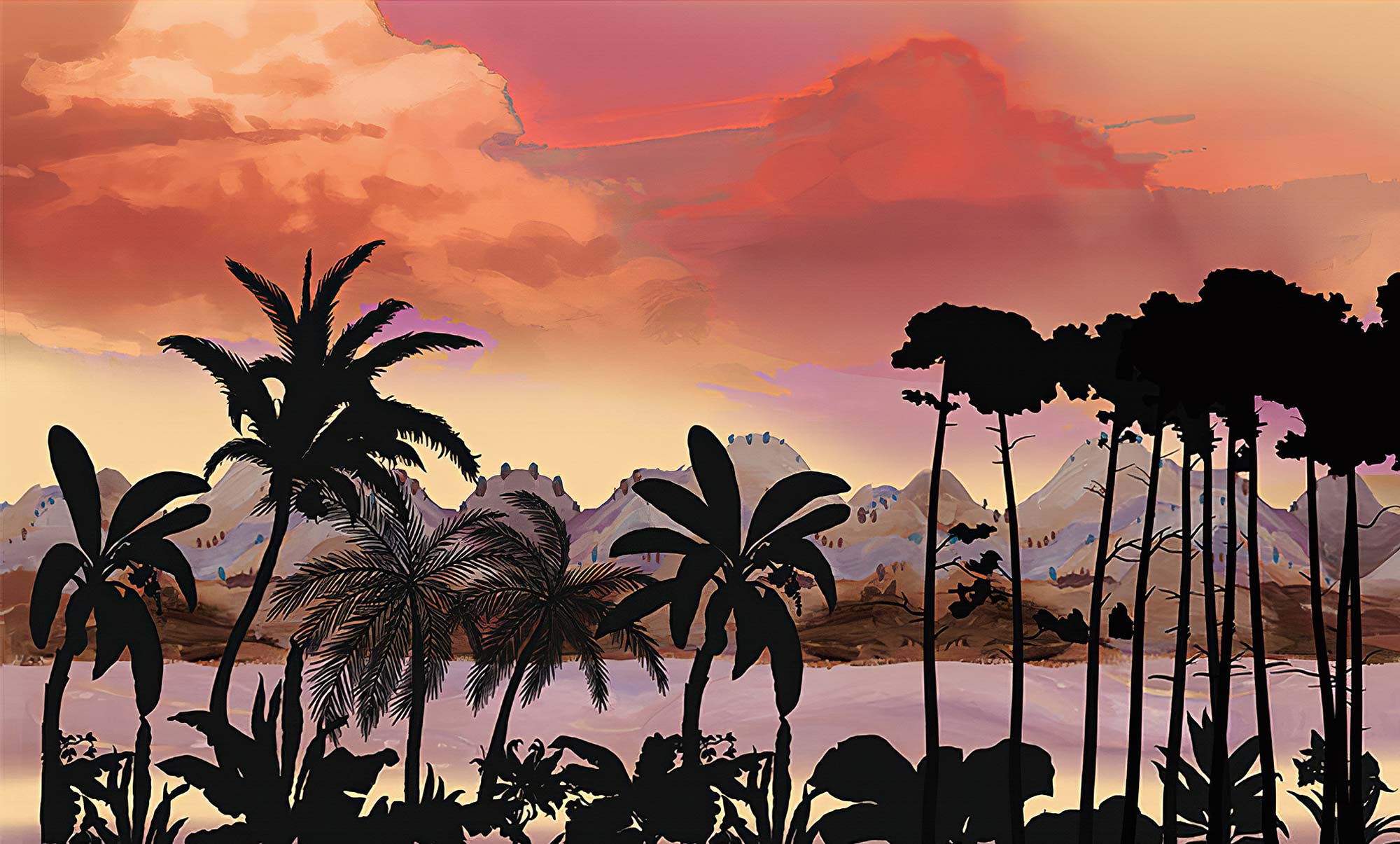 Evoke the serene beauty of a tropical sunset with this striking wallpaper. Perfect for creating a tranquil atmosphere, its warm hues and palm tree silhouettes bring an exotic touch to any room. Ideal for accent walls or a full room makeover.