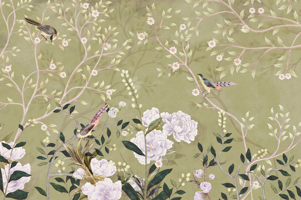 Elevate your space with our Vintage Botanical Bird Floral Wallpaper, featuring a harmonious blend of delicate flowers and chirping birds set against a subtle green background. Perfect for adding a touch of nature-inspired elegance to any room.