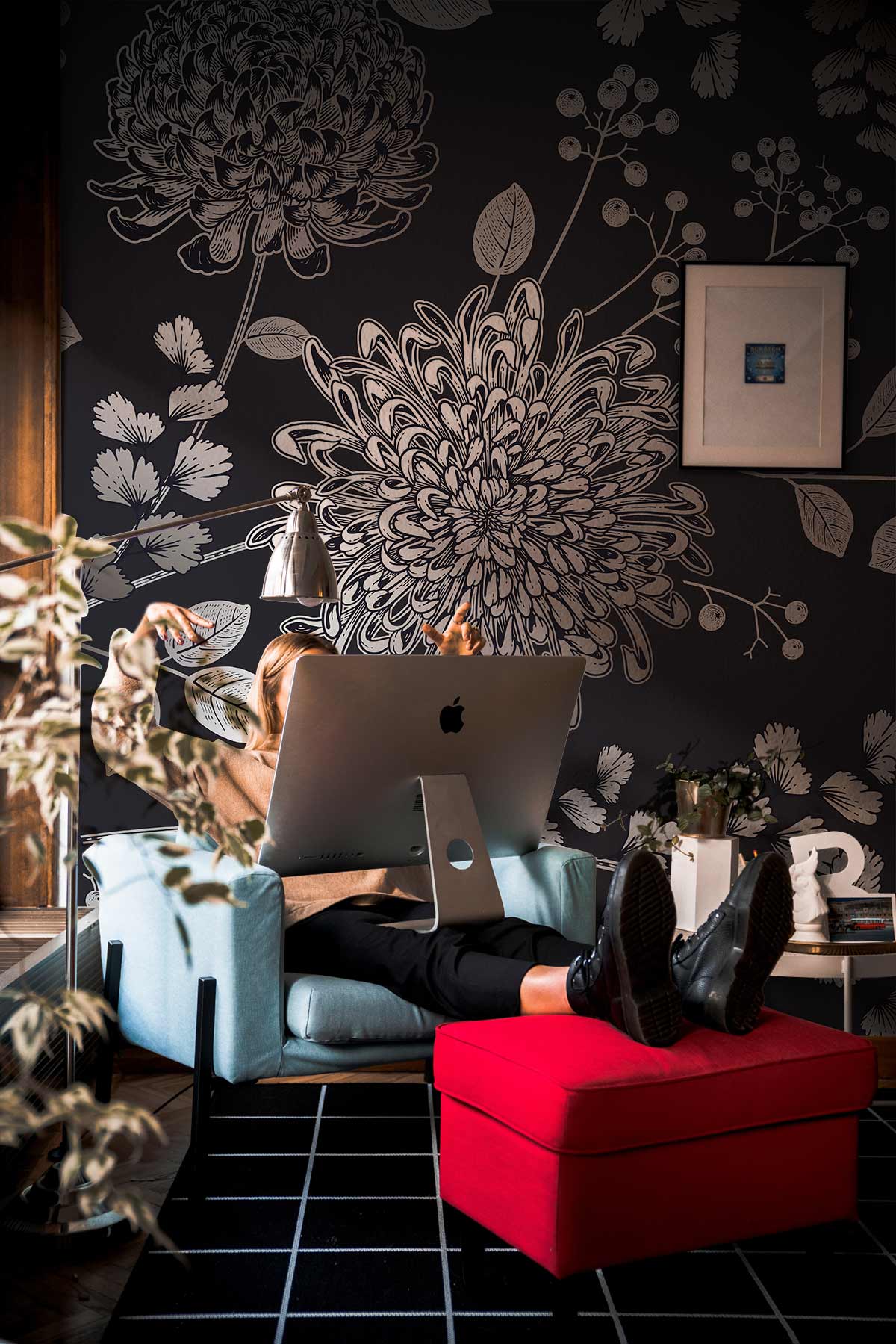 Transform your space with our Elegant Floral and Butterfly Wallpaper, featuring a stunning dark grey backdrop adorned with intricately white outlined chrysanthemums, delicate foliage, and graceful butterflies. This wallpaper adds a touch of sophistication and tranquility to any room.