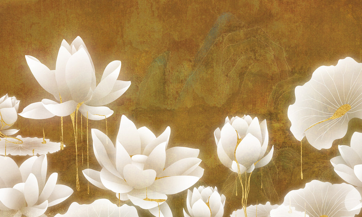 Transform your space with our luxurious gold floral wallpaper, featuring stunning white botanical patterns on a rich golden backdrop. This high-quality wallpaper adds a touch of elegance and sophistication to any room, perfect for creating an inviting, opulent environment.