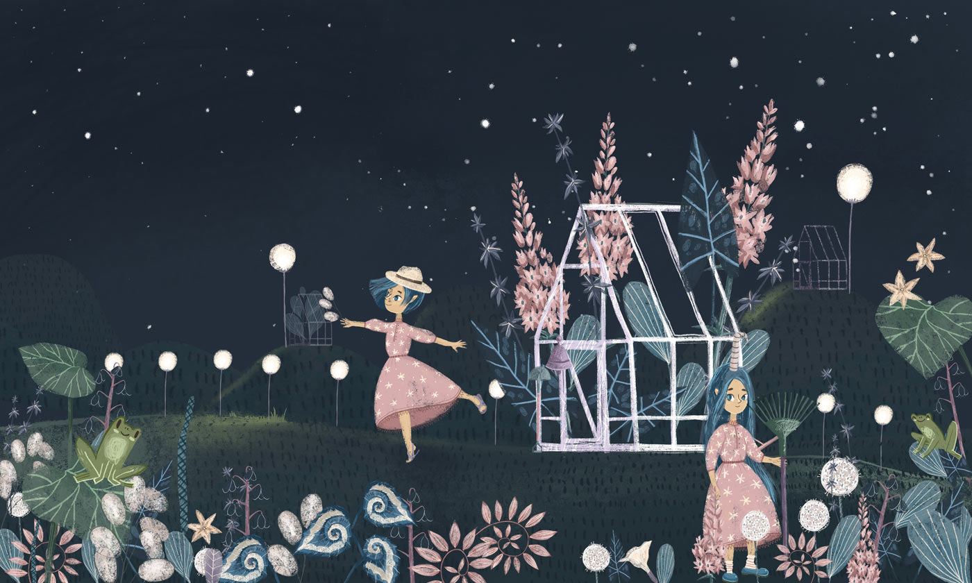 Transform a child's room with this enchanting, starry night garden wallpaper featuring playful characters and delicate floral motifs. Its elegant design brings a magical touch to any nursery or bedroom, creating a soothing environment for rest.