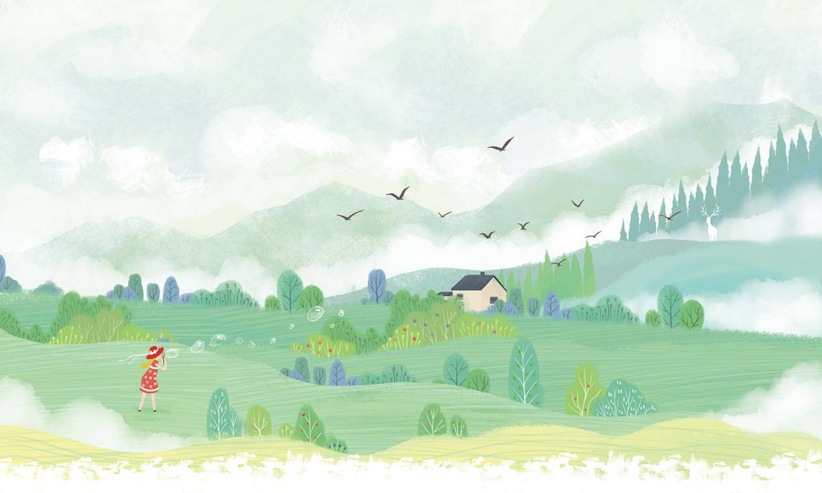 Transform your space with our serene Misty Countryside Landscape Wallpaper. Depicting a delightful rural scene with rolling hills, wispy clouds, and a gentle color palette, it's perfect for creating a peaceful atmosphere in any room.