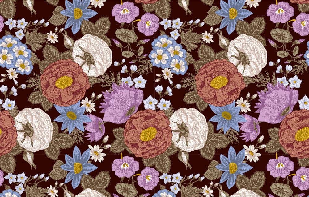 This captivating vintage floral wallpaper brings a touch of timeless elegance to any space. Featuring a rich burgundy backdrop with detailed blooms in hues of purple, beige, and white, it's perfect for creating a romantic ambiance.