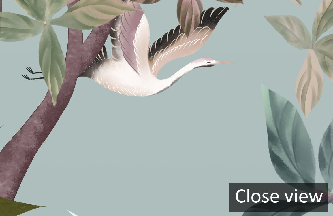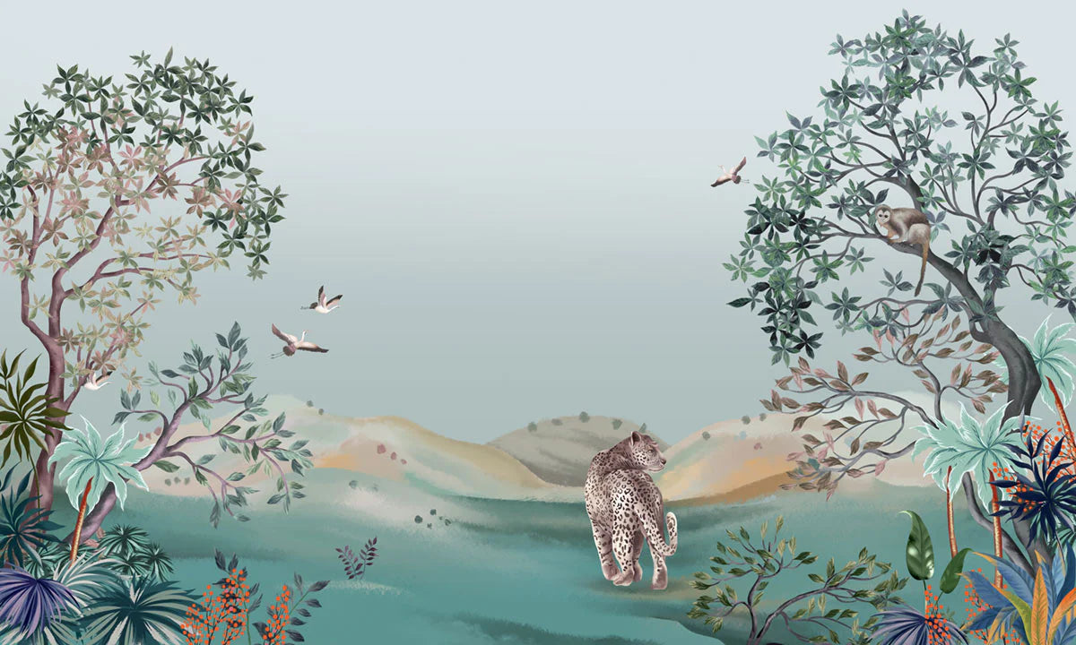 Transform your space with our enchanting Tropical Jungle Leopard Scenic Wallpaper, featuring a serene landscape with a watchful leopard, lush foliage, and graceful birds in flight. Perfect for creating a tranquil escape in your home.