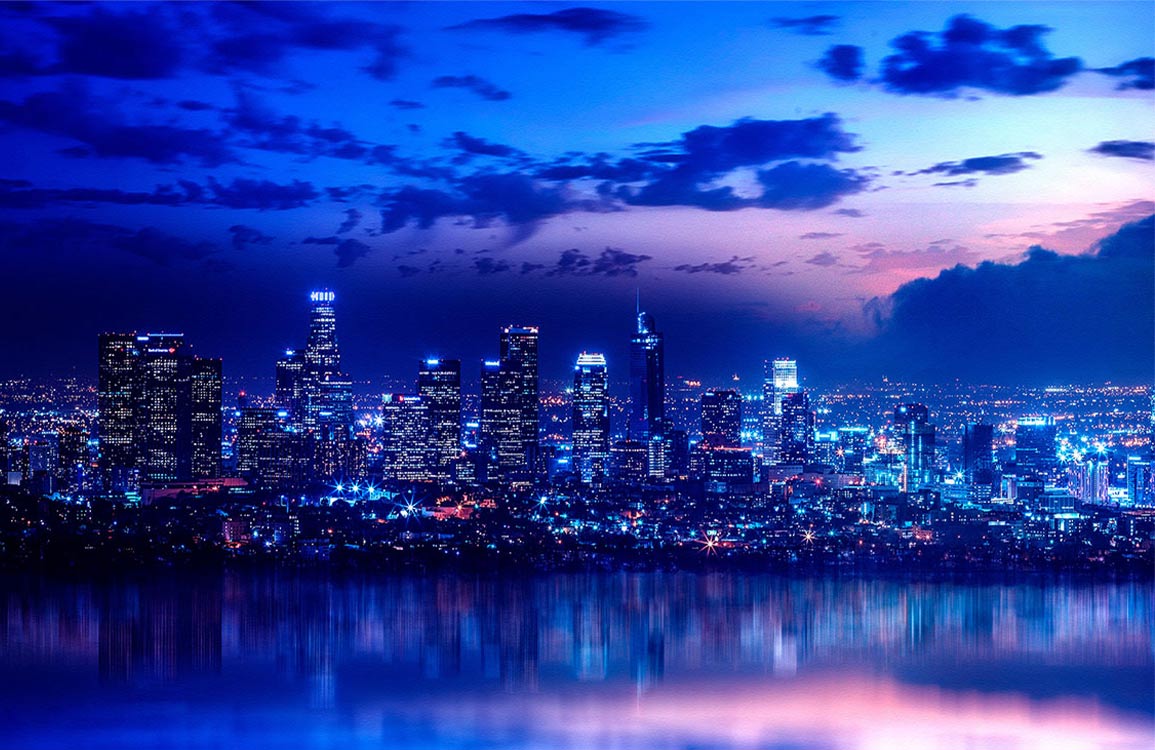 Elevate your space with our Blue Urban Skyline Reflective Wallpaper, showcasing a stunning cityscape at dusk with twinkling lights and a serene water reflection. Perfect for creating a modern and dynamic atmosphere in any room.