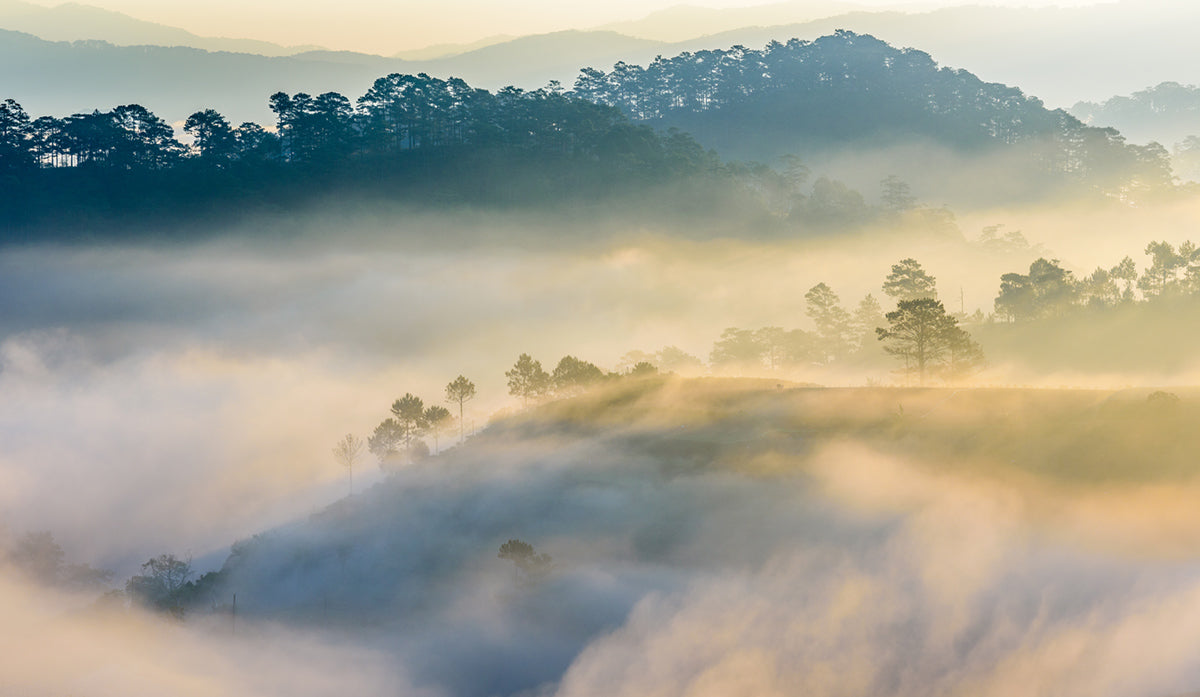 Elevate your space with this serene Misty Forest Sunrise wallpaper, featuring a tranquil scene of a forest enveloped in a soft, ethereal fog at dawn. Its gentle colors and peaceful landscape create a soothing ambiance, perfect for relaxation.