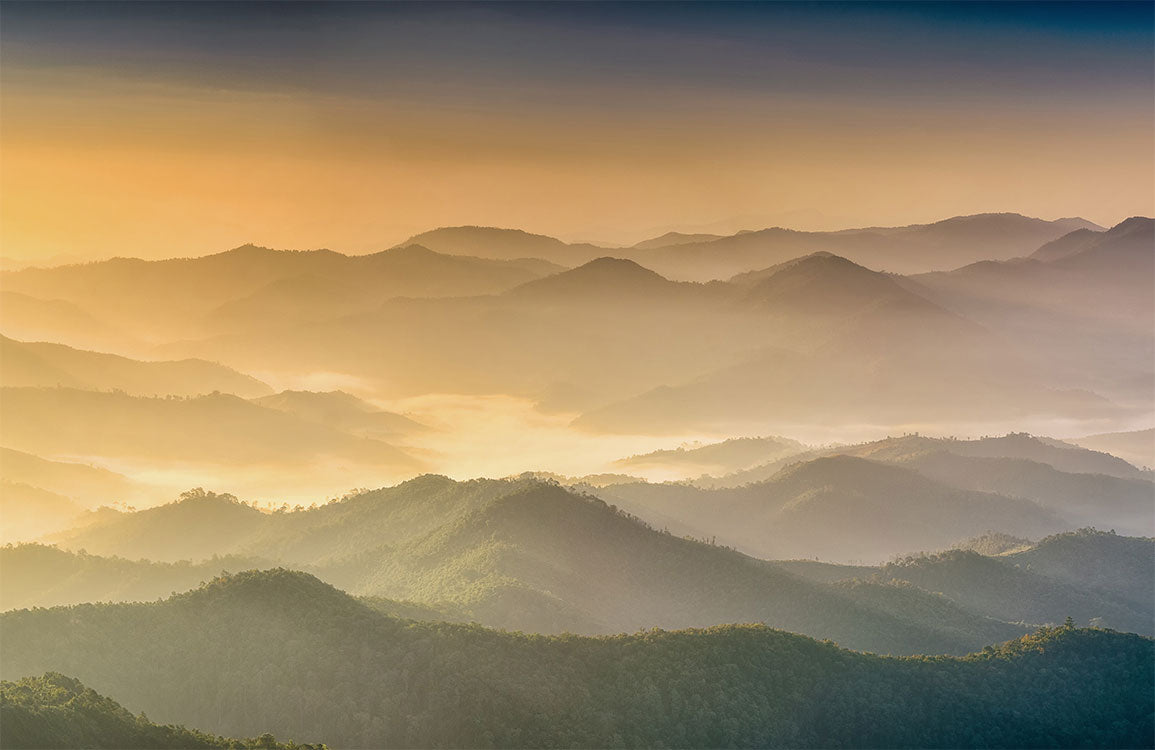 Capture the tranquil beauty of dawn with our Sunrise Mountain Mist Landscape Wallpaper. Perfect for creating a serene atmosphere, this wallpaper features soft gradients of orange and blue, depicting the gentle awakening of nature atop misty mountains.