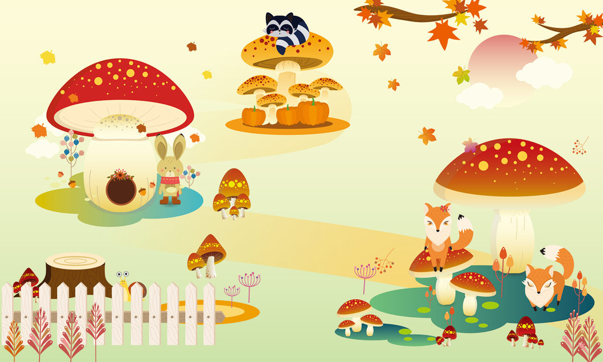 Bring your child's imagination to life with our Enchanted Forest Animal Kids Wallpaper! Perfect for creating a whimsical play space, it features playful woodland creatures and colorful mushrooms set against a soft pastel backdrop.