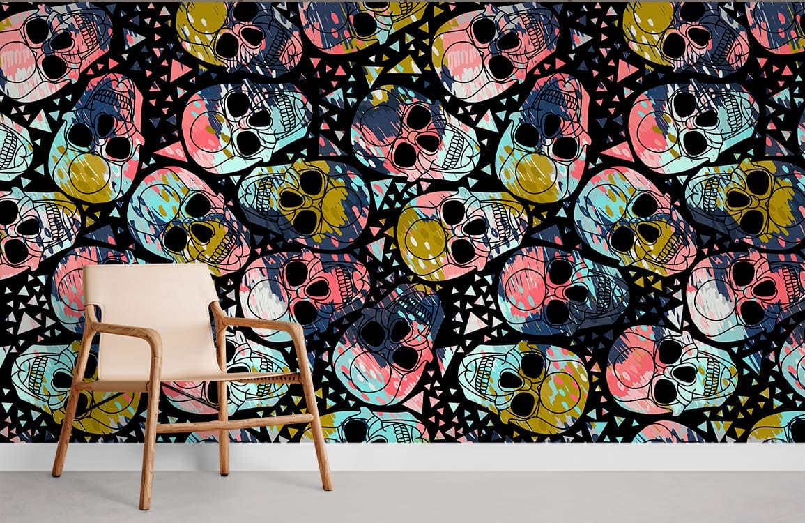 Transform any room with our Colorful Abstract Skull Pattern Wallpaper, an avant-garde design combining vibrant hues with a bold skull motif. It's perfect for creating a captivating accent wall or a lively, artistic atmosphere with a modern twist.