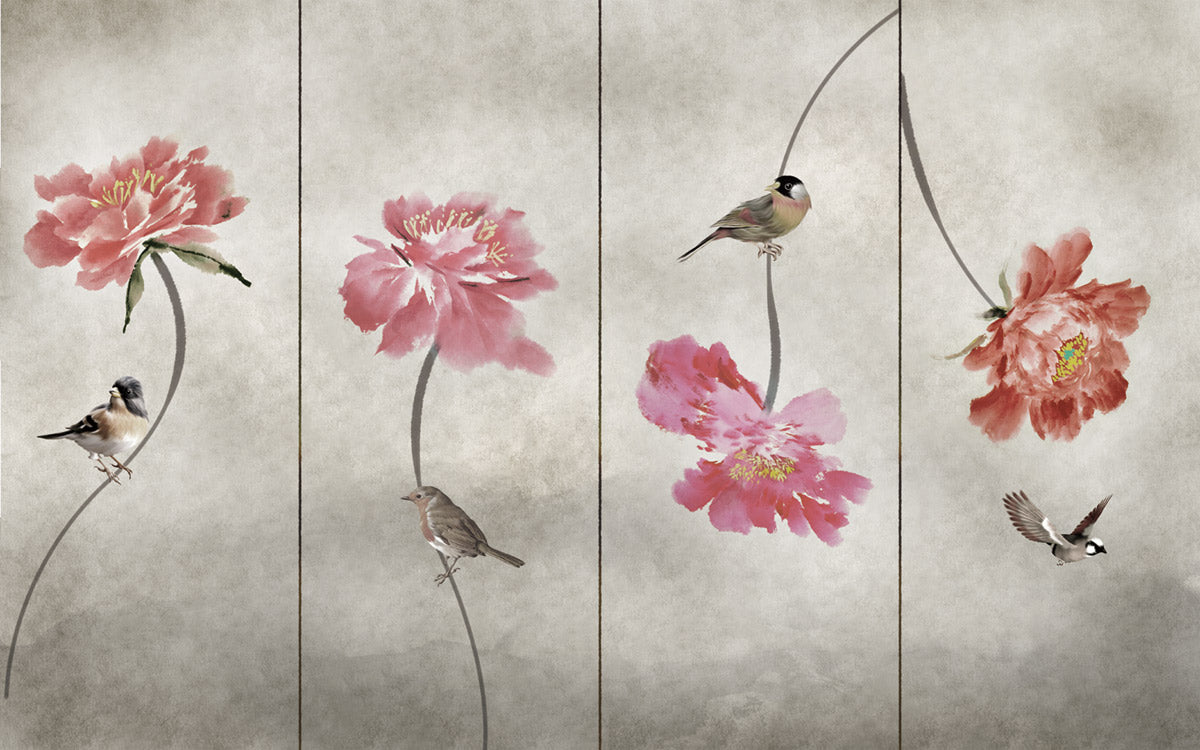 Bring serenity to your space with our watercolor-style wallpaper, featuring delicate pink flowers and charming birds. Ideal for creating a peaceful ambiance in living rooms or bedrooms, it's perfect for those looking to add a touch of nature-inspired elegance to their interiors.