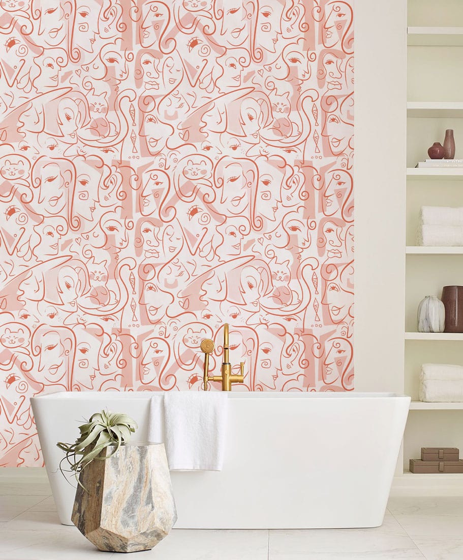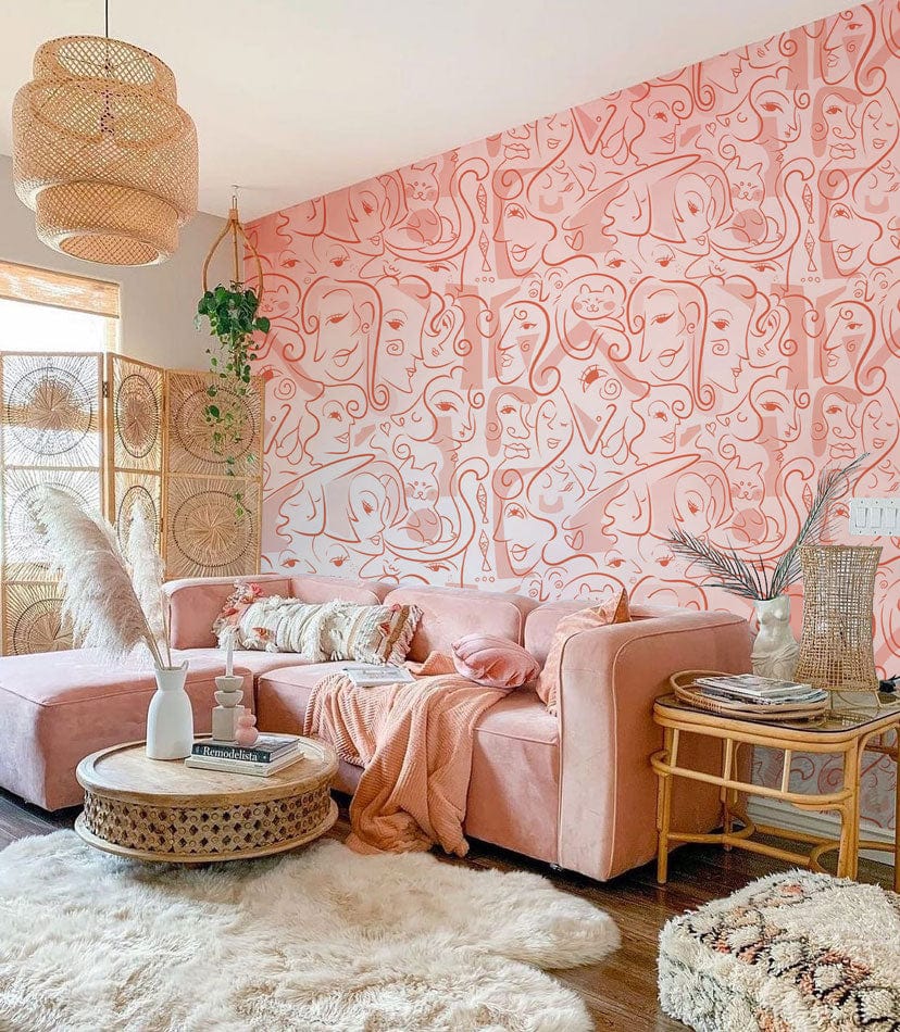 Elevate your space with our Abstract Pink Faces Art Wallpaper, featuring a continuous line drawing of whimsical faces. Its soft pink hue and unique design add a modern artistic touch to any room, perfect for creating a chic and sophisticated ambiance.