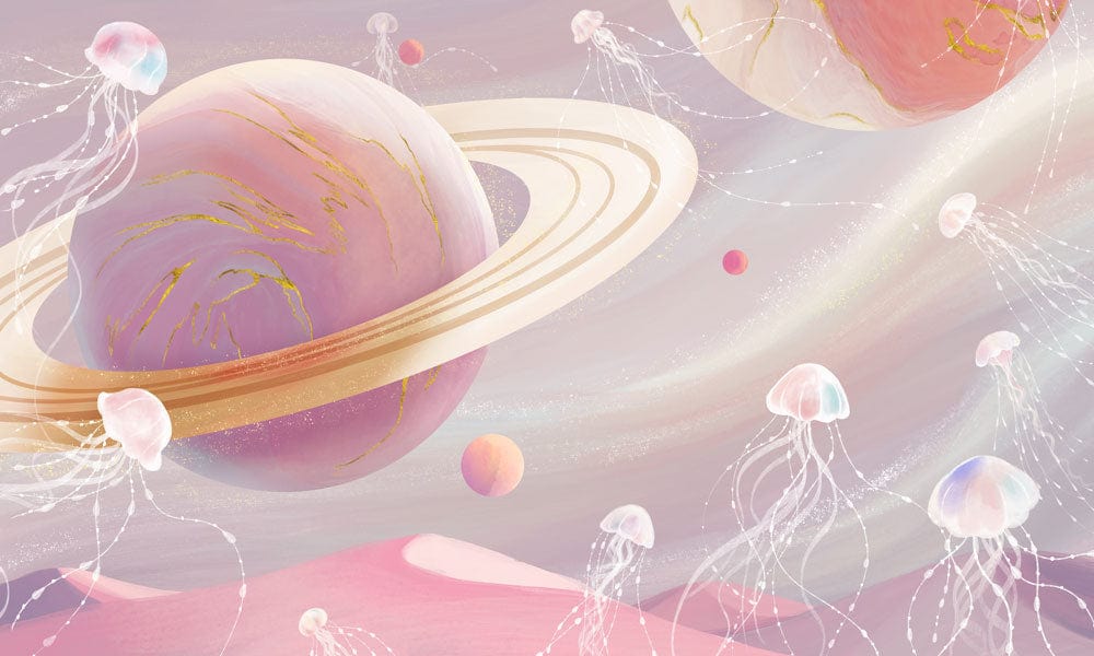 Escape to a dreamy universe with our Whimsical Planetary Jellyfish Wallpaper, perfect for creating a serene, imaginative space. Pink and purple hues blend with celestial motifs to transform any room into a tranquil cosmic sanctuary.