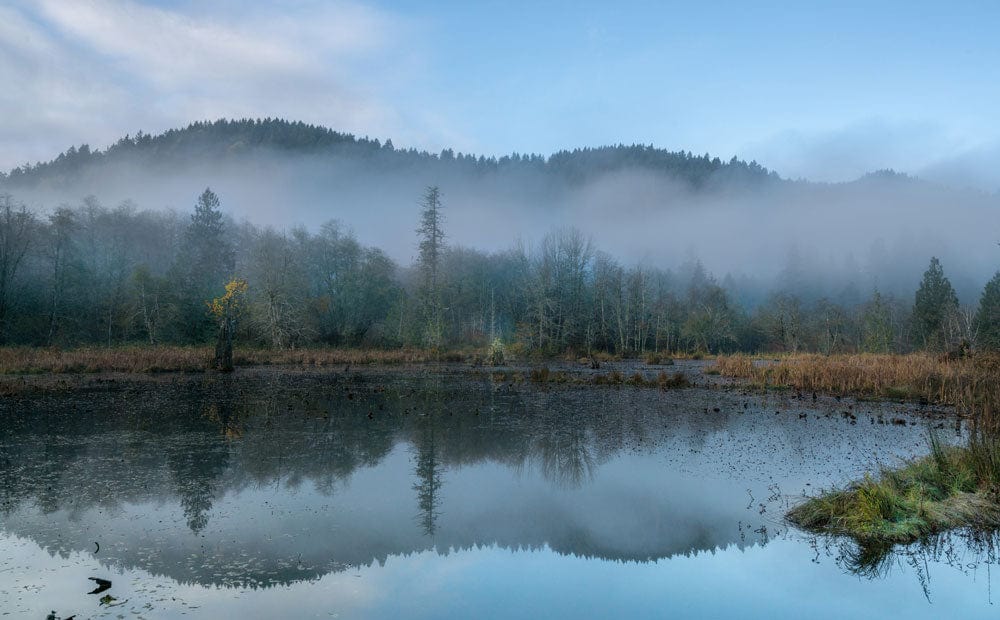 Transform your space with our Serene Misty Forest Lake Wallpaper. This tranquil scene of a mist-covered forest reflected in a still lake brings a peaceful aura to any room, enhanced by soft natural hues and a realistic landscape design.