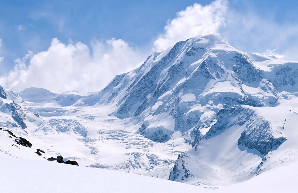 Transform your space with our Serene Snowy Mountain Peak Wallpaper. Experience the tranquility of snow-capped mountains and expansive skies in the comfort of your home. Ideal for creating a calm and peaceful atmosphere.