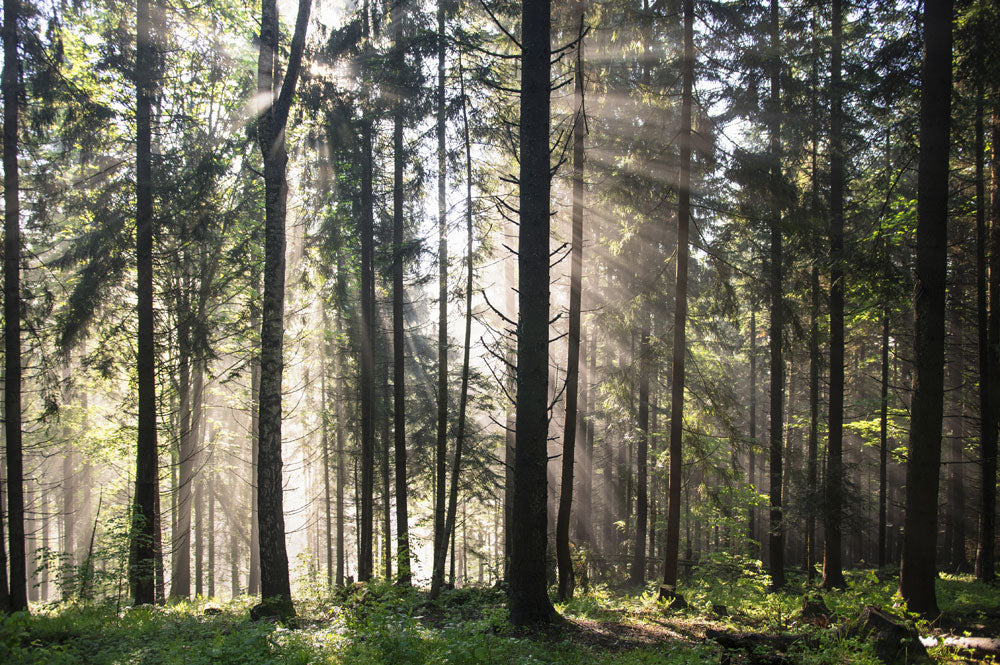 Indulge in the serenity of nature with our Tranquil Forest Sunbeam Wallpaper, featuring ethereal sunbeams piercing through verdant woodland. Perfect for infusing any room with a calm, natural ambiance.