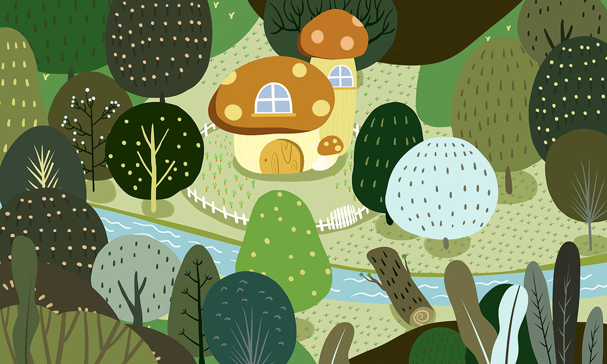 Bring enchantment to your space with our Whimsical Forest Landscape Wallpaper. Perfect for sparking imagination, this playful design features a storybook-inspired forest with quirky trees and a charming mushroom house, creating a delightful backdrop for any room.