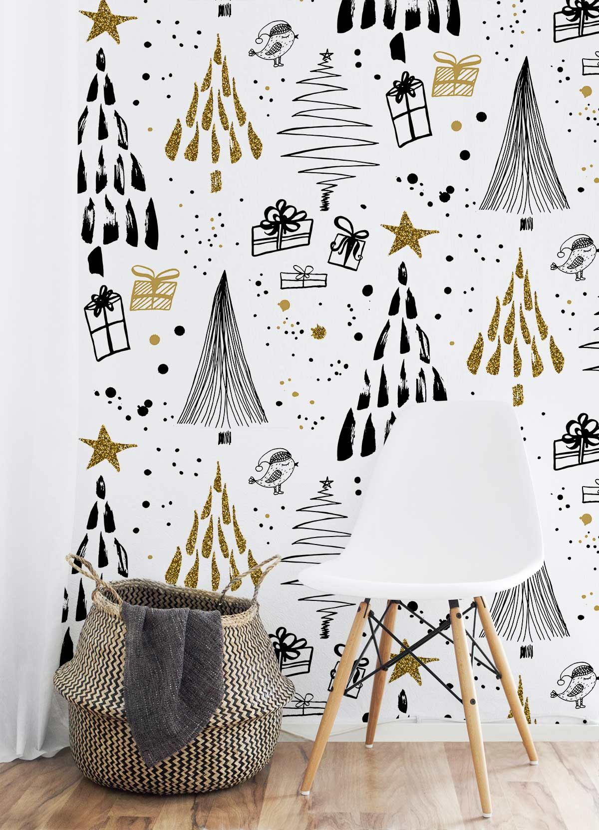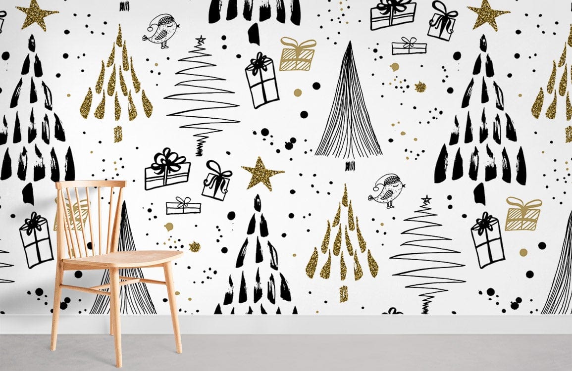Bring the joy of the holiday season into your home with this playful black and gold doodle pattern wallpaper. Perfect for creating a festive atmosphere in any room, this design features charming illustrations of trees, gifts, and stars.