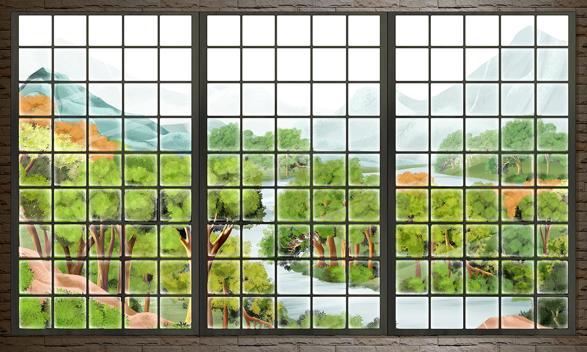 Transform any room with our Serene Landscape Window View Wallpaper. Featuring a calming scene of lush greenery and tranquil waters, this wall art instantly creates a peaceful sanctuary. Ideal for an immersive natural vibe in your living or office space.