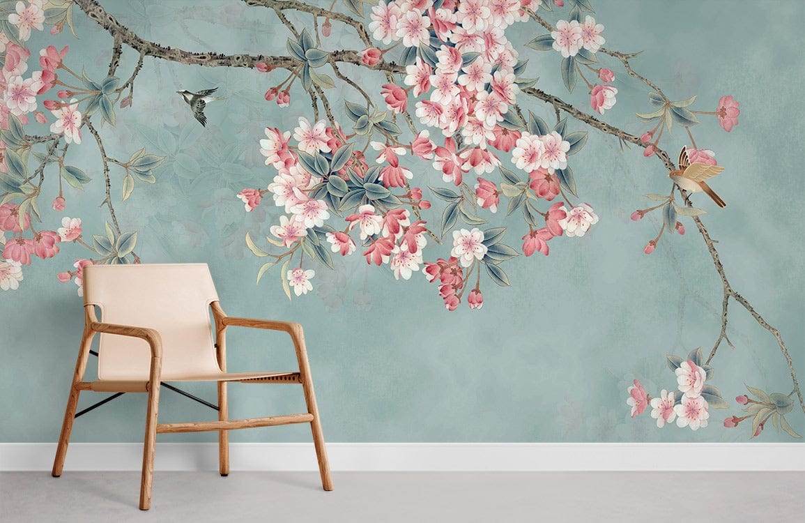 Transform your space with our Elegant Cherry Blossom Branches Wallpaper, featuring delicate florals and birds on a tranquil teal backdrop to create a serene ambiance. Perfect for bringing a touch of nature's beauty indoors.