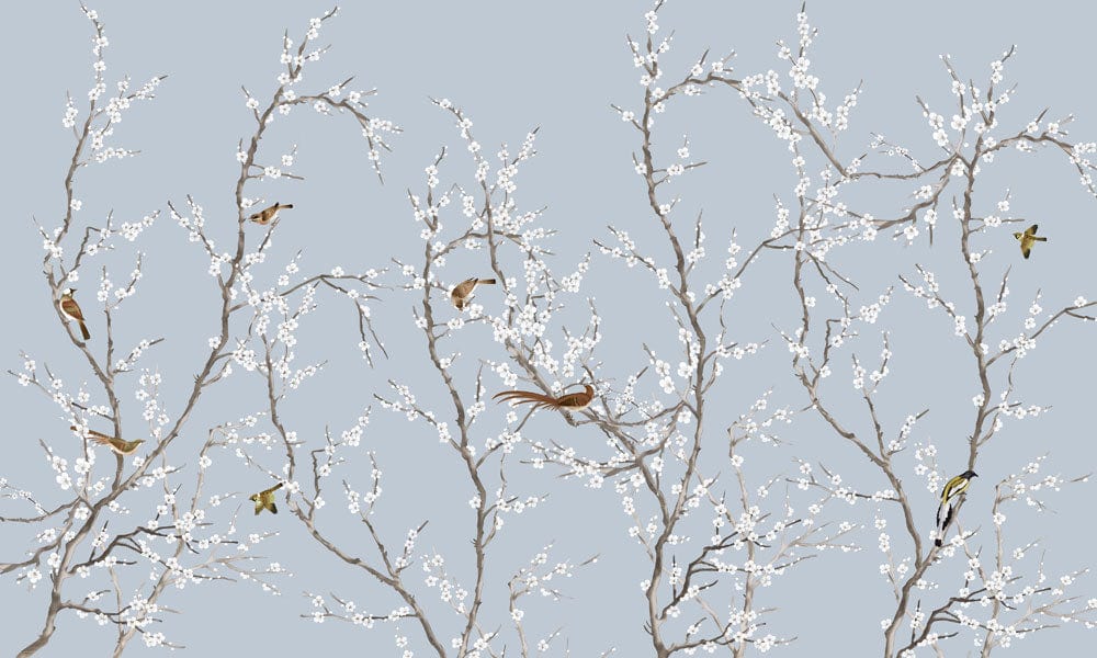 Invite nature into your home with our Elegant Bird Blossom Branch Wallpaper, a sophisticated design featuring delicate white blossoms and serene birds perched on winding branches against a soft grey backdrop, perfect for creating a tranquil space.