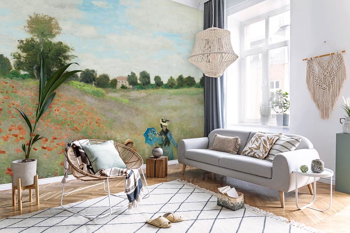 Embrace the tranquility of nature with our Rustic Poppy Field Landscape Wallpaper. This charming design adds a touch of vintage beauty to any space, creating a peaceful and inviting atmosphere with its delicate poppies and pastel skies.
