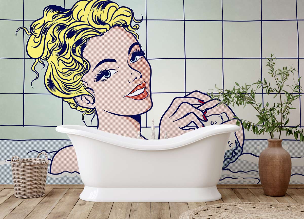 Transform your space with our vibrant Retro Pop Art Bathing Beauty Wallpaper, perfect for adding a dose of playful charm. Its eye-catching design, reminiscent of classic comic strips, creates a lively and entertaining atmosphere in any room.